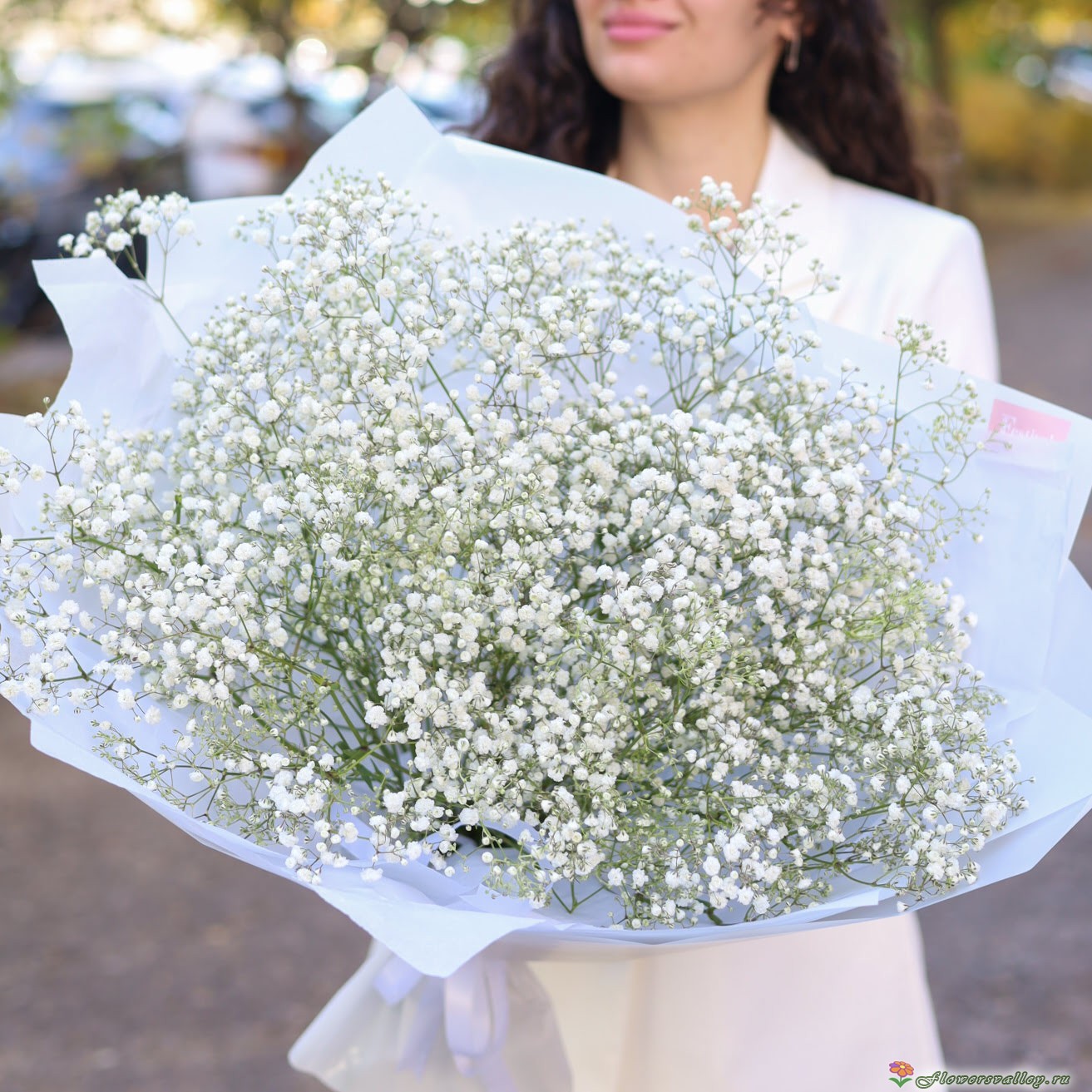 Состав букета: Гипсофила - 15 шт., пленка, лента атласная.