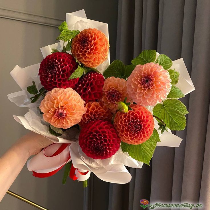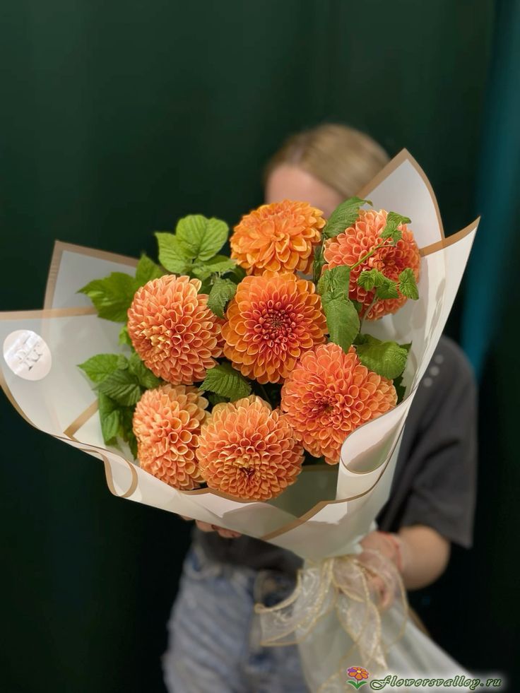 Состав: оранжевый георгин  - 11 шт, упаковка, лента. Размер: высота - 50 см, ширина - 35 см.